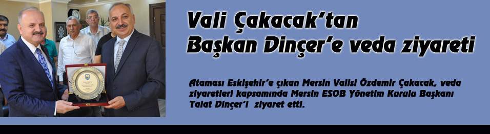 Valiler Kararnamesi ile ataması Eskişehir’e çıkan Mersin Valisi Özdemir Çakacak, veda ziyaretleri kapsamında Mersin ESOB Yönetim Kurulu Başkanı Talat Dinçer’i ziyaret etti. Samimi bir ortamda gerçekleşen ziyarette Vali Çakacak, Başkan Dinçer’e Valilikle olan uyumlu çalışmalarından dolayı teşekkür etti.
