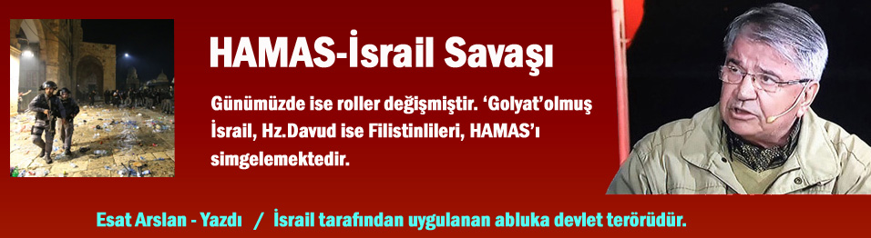 İsrail’in tavrı, “Şişkin ego”su ve şişkin egosunun davranışsal yansıması olan “Kibir-Kibiryası”o kadar yüksektir ki, adeta “Ben buraların, Kenan ülkesinin Golyat’ıyım” demeye getirmektedir. Her şeyi ‘ben yaptım oldu’kalıbında ifade etmektedir. “Şişkin ego” öylesine bir gelişme göstermiştir ki, bu tam anlamıyla “Narsistik Bozukluk”tur, hatta bir anlamda “Hubris Sendromu” (Kendini Tanrı sanma) noktasına ulaşmıştır. (2) Ancak, devler ya da kendilerini dev aynasında görenler, öyle göründükleri kadar güçlü değildir. Mitolojik bir hikâyenin kahramanları olan Davud ile Golyat(David andGoliath)arasındaki düello ‘Eski Ahit’te ve Kur’an’da ne güzel anlatılır. M.Ö. 11. yüzyılda Kenan ülkesinde, bugünkü Filistin, geçtiği rivayet edilir. Tarihler boyunca anlatıla gelen meşhur düelloya tutuşan Davud ve Golyat(Câlût)’ın hikâyesi aynı soydan gelen İsrailoğullarıyla Filistinlilerin savaşı sırasında yaşanır. Yalnız bir farkla üç metrelik cüssesiyle adeta bir “dev” olan ‘Golyat’ Filistinlidir.  Davud ise savaşta görevi yiyecek taşımak olan henüz çocuk yaşta bir gönüllüdür. Aslı Davut Peygamberdir. Günümüzde ise roller değişmiştir. ‘Golyat’olmuş İsrail, Hz.Davud ise Filistinlileri, HAMAS’ı simgelemektedir.