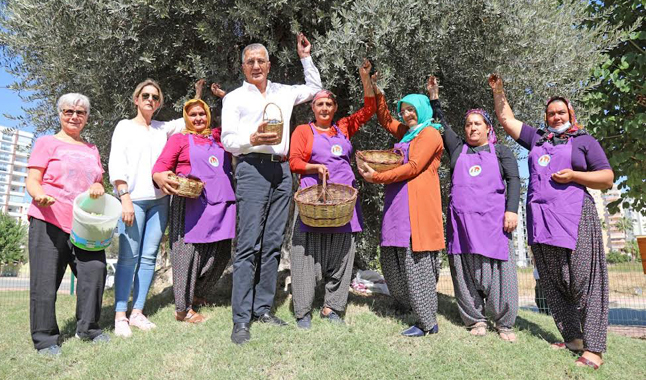 Mersin Mut’ta hızar atölyesinde odun olmak için beklerken Mezitli Belediyesi ekipleri tarafından getirilerek Mezitli Demokrasi Meydanına dikilen anıt ağaç, zeytin vermeye devam ediyor. Mezitli Belediye Başkanı Neşet Tarhan, Kadın Üretici Pazarında tezgâh açan kadınlarla zeytin topladı.
