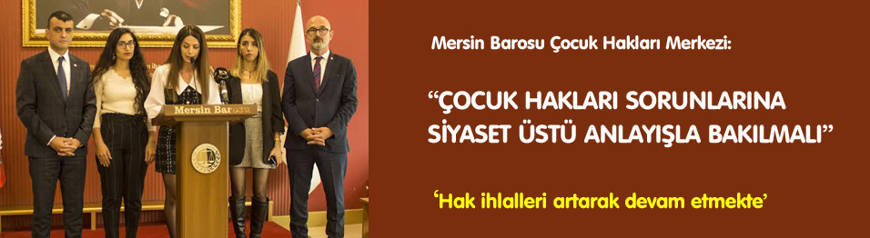 Mersin Barosu Çocuk Hakları Merkezi, 20 Kasım Dünya Çocuk Hakları Günü nedeniyle basın açıklaması yaptı. Açıklamada, çocukların daha sağlıklı ve gelişimlerine uygun bir yaşam sürdürmeleri için; çocuk hakları sorunlarına siyaset üstü bir anlayışla bakılması ve çocuğun üstün yararının gözetilmesi gerektiği vurgulandı.