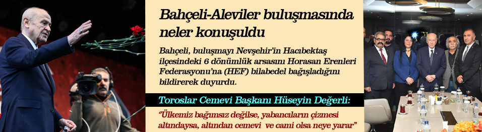MHP Lideri Devlet Bahçeli’nin Mersin’de Alevi kanaat önderleriyle bir araya gelmesi gündem oldu. Bahçeli, buluşmayı Nevşehir’in Hacıbektaş ilçesindeki 6 dönümlük arsasını Horasan Erenleri Federasyonu’na (HEF) bilabedel bağışladığını bildirerek duyurdu. Bahçeli duyurusunun ardından sosyal medya hesabından bir de açıklama yaparak “Alevi de biziz, Sünni de biziz” dedi.