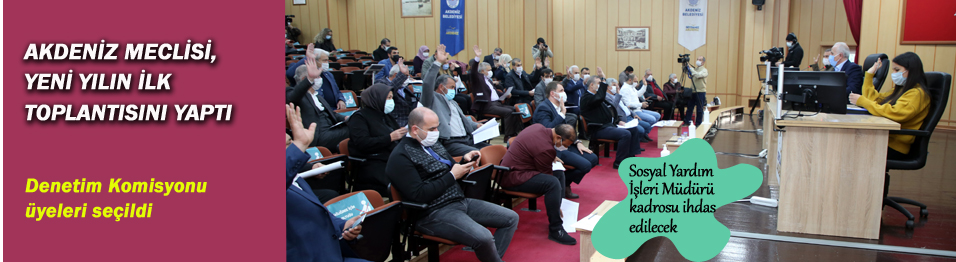 * Akdeniz Belediye Meclisi’nin Ocak ayı birinci birleşimi, belediye konferans salonunda düzenlendi. Açılış, Yoklama, Saygı Duruşu ve İstiklal Marşı ile başlayan toplantıda, bir önceki Meclis tutanak özeti okunup oylandı.