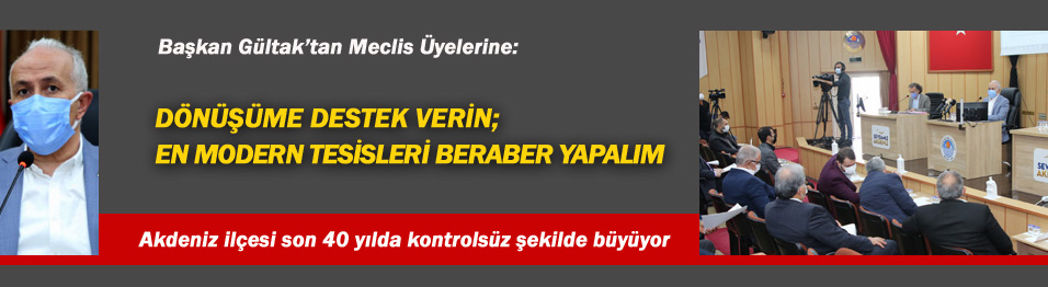 Başkan Gültak; Akdeniz ilçesinin son 40 yılda kontrolsüz şekilde büyüdüğüne dikkat çekti; "Kentsel ya da yerinde dönüşüm. Adına ne derseniz deyin. Gelin destek verin. Bu şehri beraber dönüştürelim. En modern tesisleri beraber yapalım" dedi.