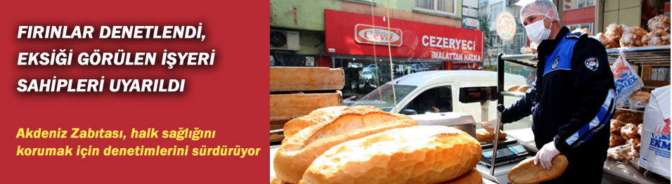 * Akdeniz Belediyesi, halk sağlığını korumak amacıyla, başta fırınlar olmak üzere, gıda üretimi ve satışı yapan market ve işyerlerine yönelik hijyen, temizlik, ekmeklerin gramajı, fahiş fiyat kontrolü ile ürünlerin menşei ve son tüketim tarihi konularında denetimlerini aralıksız sürdürüyor.