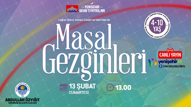 Mersin Yenişehir Belediyesi,  tiyatro oyunlarını çocukların evine getirmeye devam ediyor. Yenişehir Şehir Tiyatroları oyuncuları Çağlar Ekinci, Volkan Güneri ve Veli Polat’ın sahnelediği ve ilk bölümüyle minik izleyicilerden tam not alan ‘Masal Gezginleri’ oyunun ikinci bölümü 13 Şubat Cumartesi saat 13.00’de yayınlanacak. 4 ve 10 yaş arasındaki çocuklara hitap eden oyunda; çevre, doğa, sevgi, doğruluk gibi kavramlar hikâyelerle anlatılıyor.  Oyunda ayrıca, çocukların karşılaştıkları herhangi bir olay karşısında nasıl davranılması gerektiği öğütlenirken yer yer Nasrettin Hoca’nın ders niteliğindeki hikâyeleri de anlatılıyor.