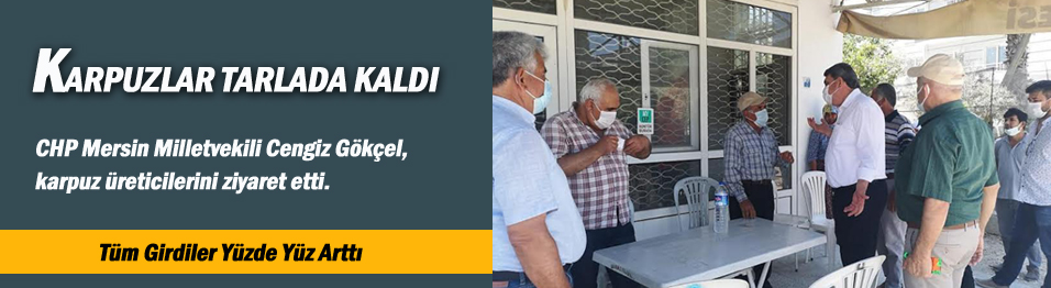 CHP Mersin Milletvekili Cengiz Gökçel, karpuz üreticilerini ziyaret etti. Ürünlerin tarlada kaldığının altını çizen Gökçel, “Tüm girdiler arttı. Bu ürünün yetişmesinde en önemli girdi gübre ve son 1 yılda yüzde yüz zam geldi. Ziraat Bankası’na ve piyasaya olan borçlar var. Karpuzlar tarlada kaldı. Ziraat Bankası ve Tarım Kredi Kooperatifleri sizin borcunuzun faizini silip borcu uzun vadede yapılandıracağına, Ziraat Bankası gıda firmalarına, basın kuruluşlarını alacak yandaşlara kredi veriyor. Bu kabul edilebilir bir durum değil” dedi.Karpuz çiftçilerinin ürünlerini satamadığını ürünlerin tarlada kaldığının altını çizen Gökçel, “Tarlanın bu halini görünce insanın içinin acımaması mümkün değil” dedi.